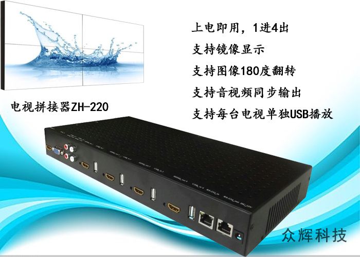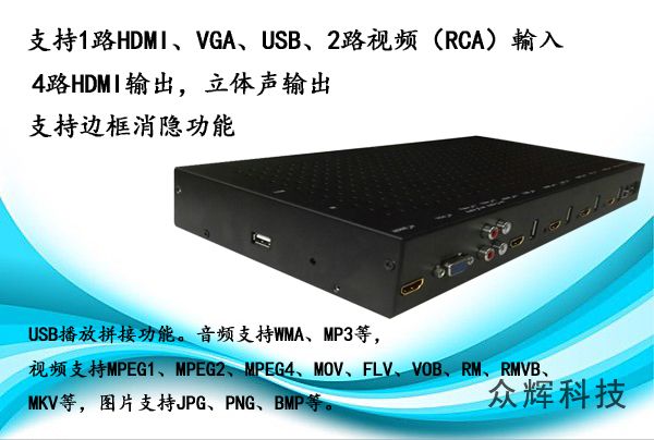 • 支持多路不同的視頻源,也可以U盤播放,無需外接矩陣分配器等,即可實現(xiàn)單臺2*2拼接,或者多臺級聯(lián)使用。